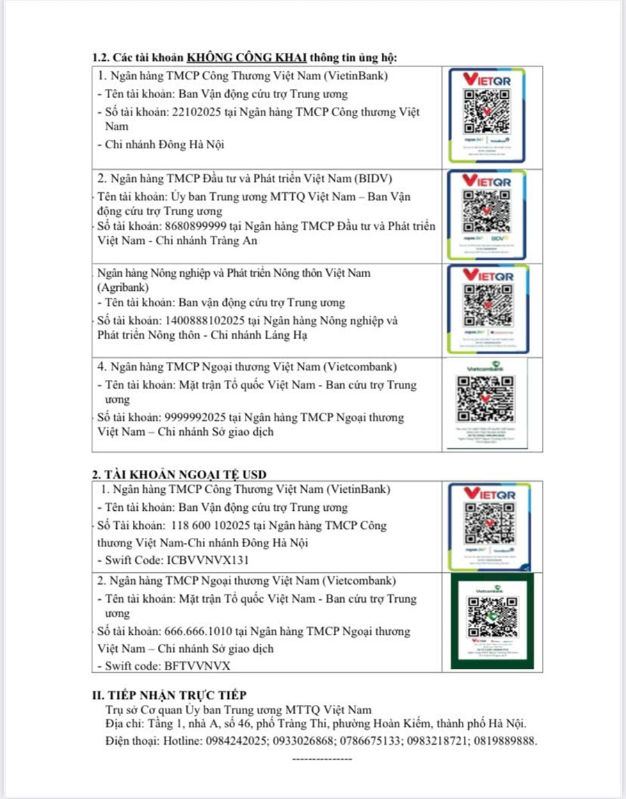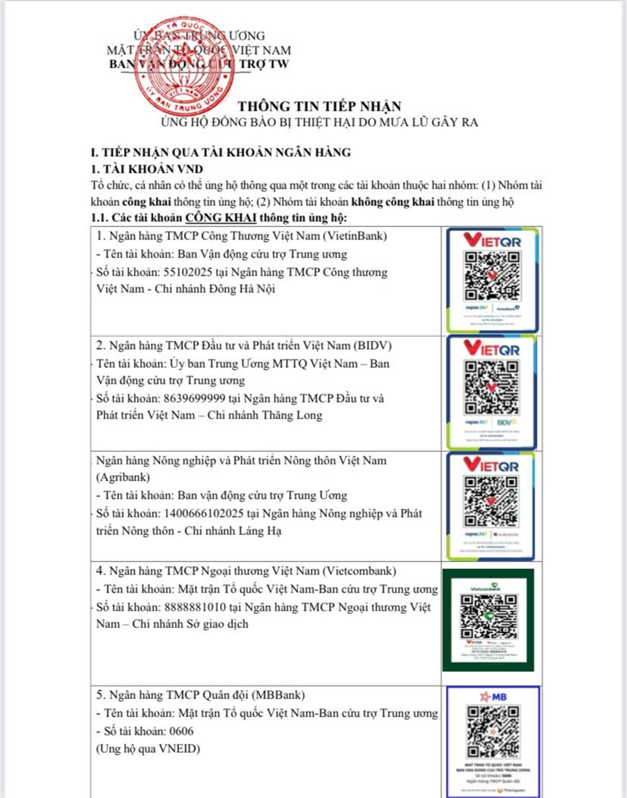 Thông tin tiếp nhận ủng hộ đồng bào bị thiệt hại do mưa lũ gây ra.