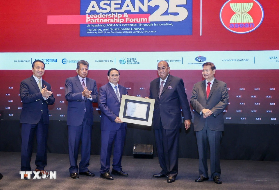 Chủ tịch Viện nghiên cứu chiến lược châu Á-Thái Bình Dương trao Giải thưởng lãnh đạo ASEAN tiêu biểu năm 2025 cho Thủ tướng Phạm Minh Chính. (Ảnh: Dương Giang/TTXVN)