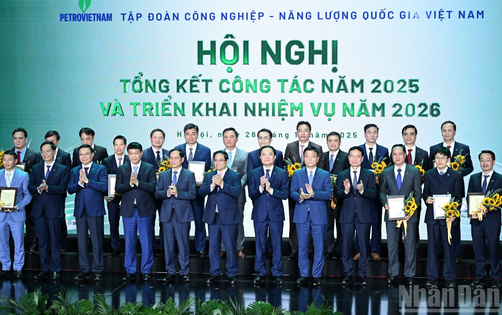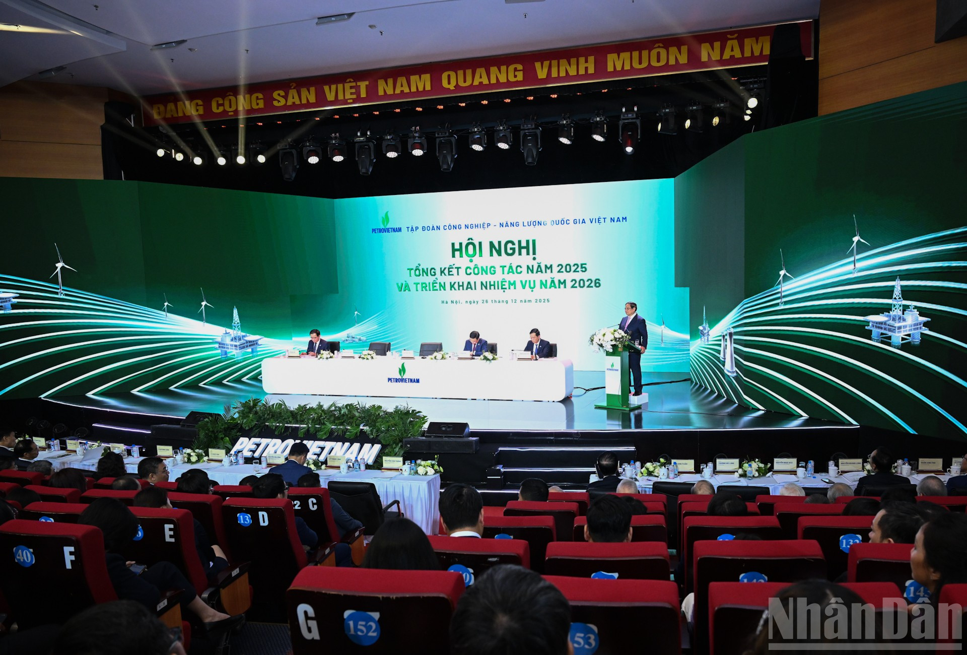 Thủ tướng Phạm Minh Chính và các đại biểu dự Hội nghị triển khai nhiệm vụ năm 2026 của Tập đoàn Công nghiệp-Năng lượng Quốc gia Việt Nam.