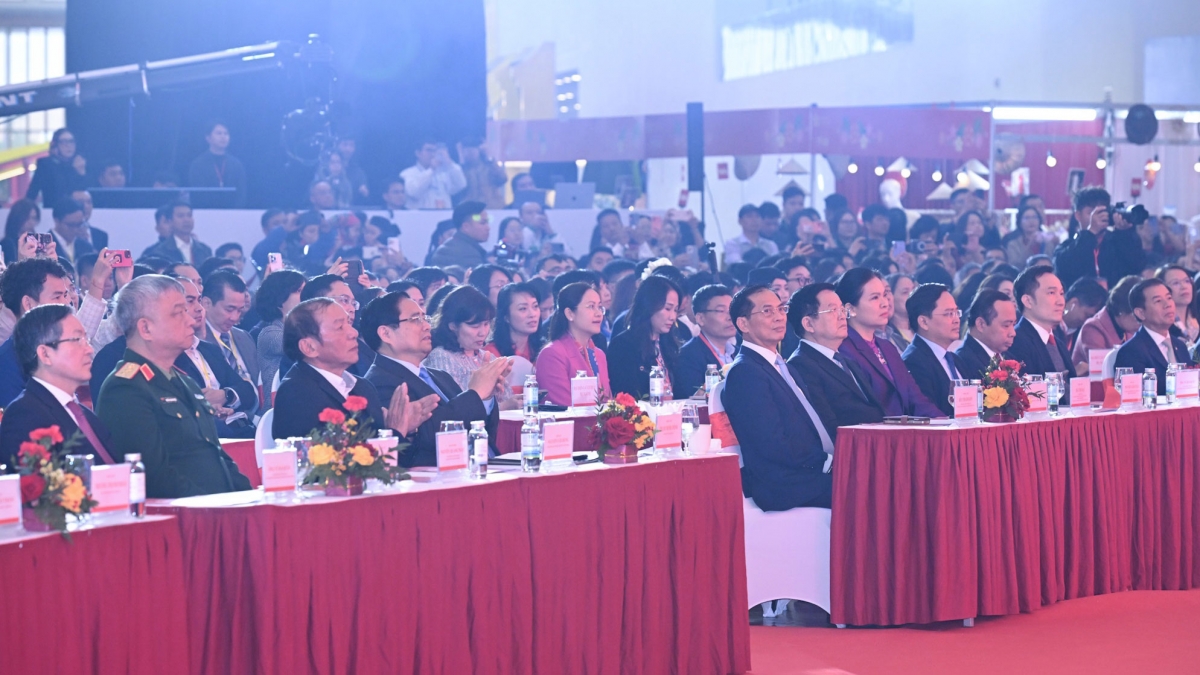 Tại buổi lễ, Thủ tướng Phạm Minh Chính và các lãnh đạo đã thực hiện nghi thức khai mạc Hội chợ Mùa Xuân 2026.