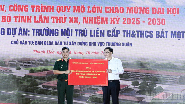 Đại diện lãnh đạo Tập đoàn Công nghiệp-Viễn thông Quân đội (Viettel) trao tặng tỉnh Thanh Hóa công trình chào mừng Đại hội đại biểu Đảng bộ tỉnh lần thứ XX. (Ảnh: TRẦN HẢI).