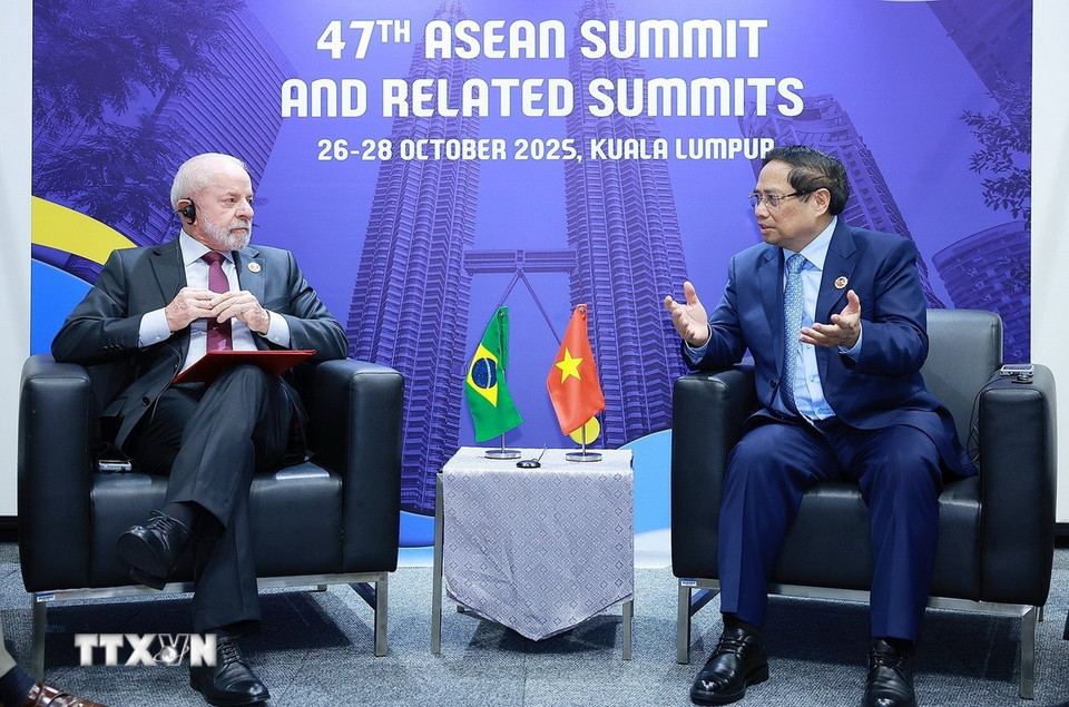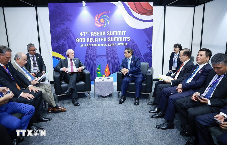 Thủ tướng Phạm Minh Chính gặp Tổng thống Brazil Lula da Silva. (Ảnh: Dương Giang/TTXVN)