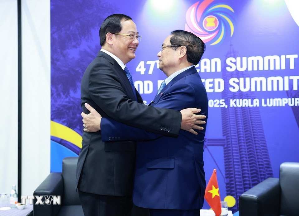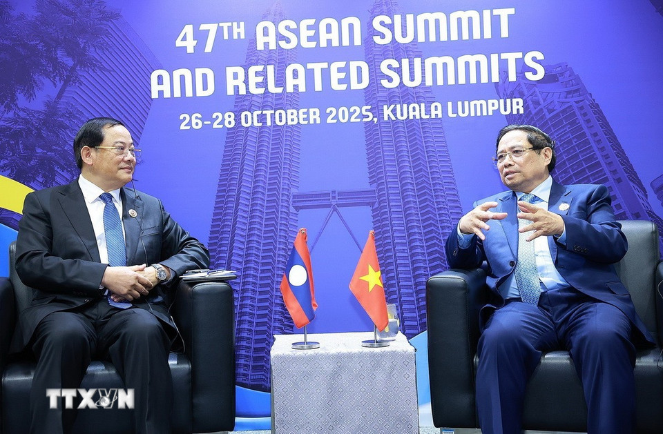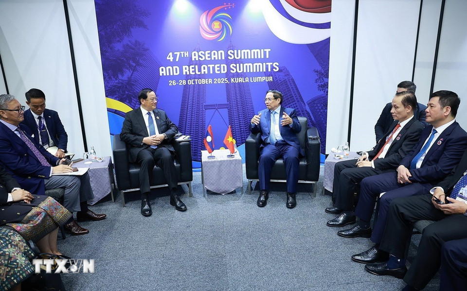 Thủ tướng Phạm Minh Chính gặp Thủ tướng Lào Sonexay Siphandone. (Ảnh: Dương Giang/TTXVN)