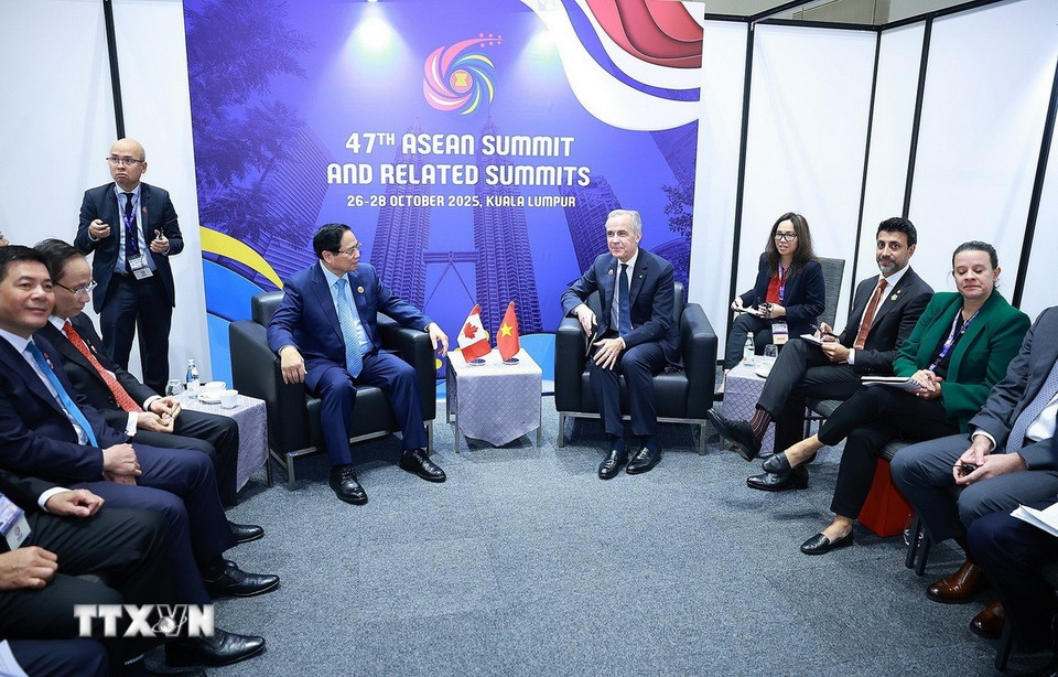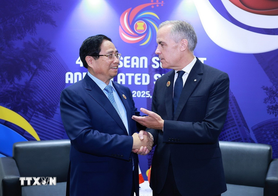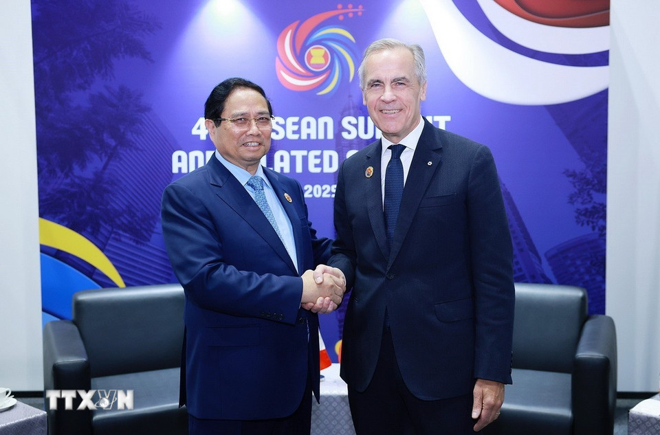 Thủ tướng Phạm Minh Chính gặp Thủ tướng Canada Mark Carney. (Ảnh: Dương Giang/TTXVN)