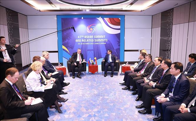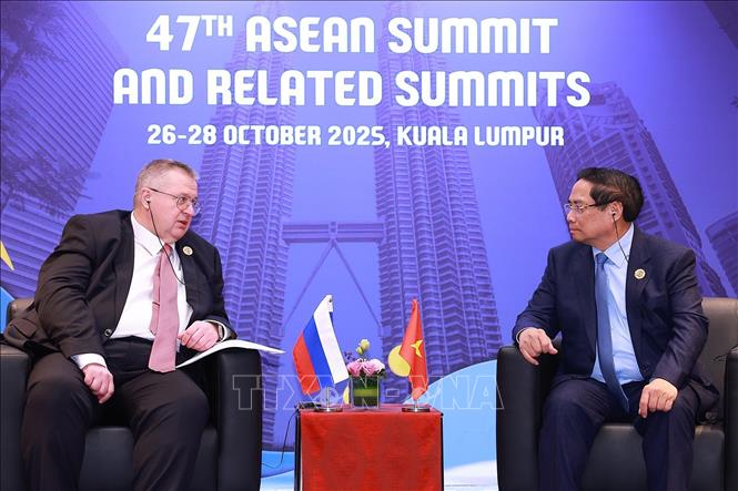 Thủ tướng Phạm Minh Chính gặp Phó Thủ tướng Nga Alexey Overchuk. Ảnh: Dương Giang/TTXVN