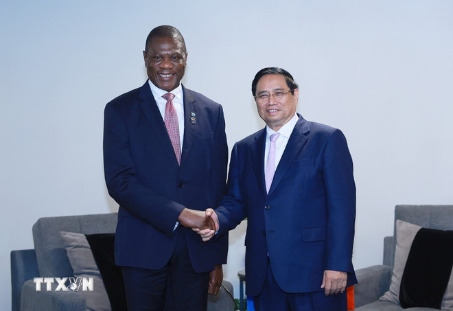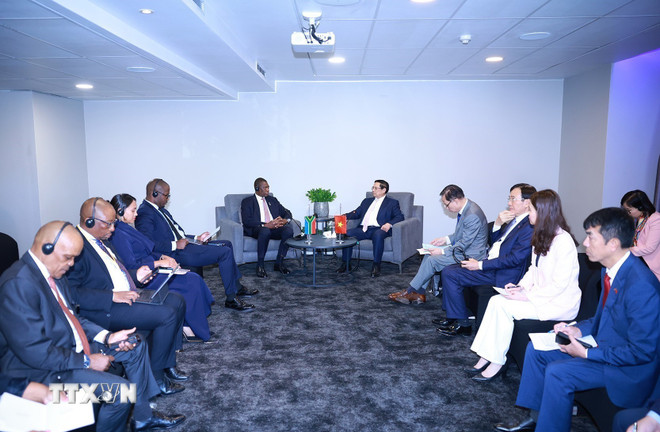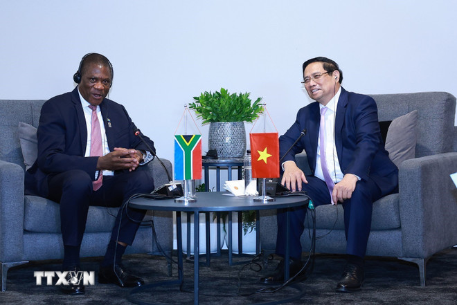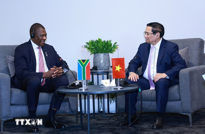 Thủ tướng Phạm Minh Chính gặp Phó Tổng thống Nam Phi Paul Mashatile. (Ảnh: Dương Giang/TTXVN)