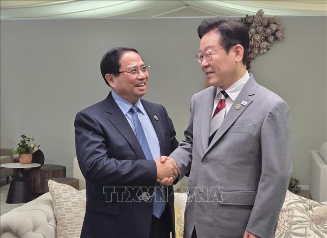 Tại cuộc gặp Tổng thống Hàn Quốc Lee Jae Myung, Thủ tướng Phạm Minh Chính chúc mừng Chính phủ và nhân dân Hàn Quốc nhân kỷ niệm 80 năm Quốc khánh; đánh giá cao vai trò chủ nhà của Hàn Quốc tại Hội nghị Cấp cao APEC lần thứ 32 và Năm APEC 2025.