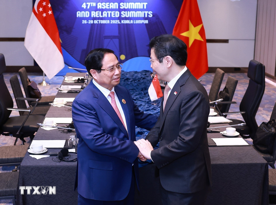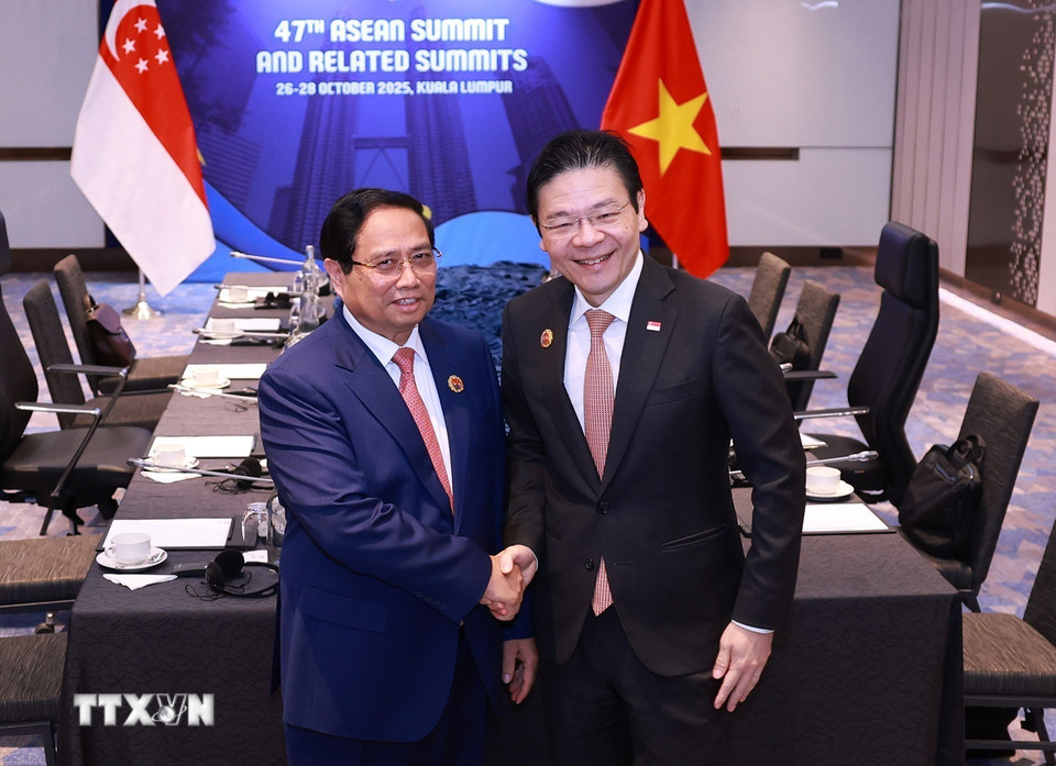 Thủ tướng Phạm Minh Chính gặp Thủ tướng Singapore Lawrence Wong. (Ảnh: Dương Giang/TTXVN)