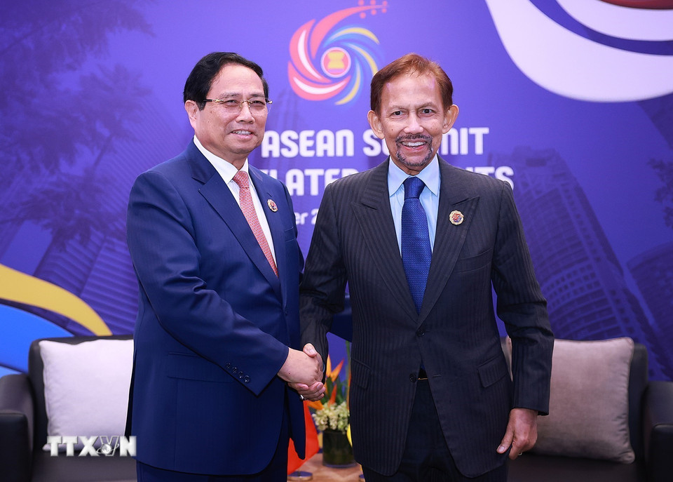 Thủ tướng Phạm Minh Chính gặp Quốc vương Brunei Hassanal Bolkiah. (Ảnh: Dương Giang/TTXVN)