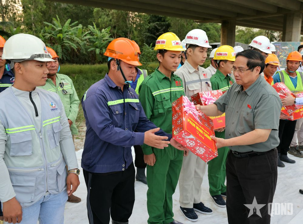 Thủ tướng Phạm Minh Chính thăm, tặng quà người lao động đang thi công dự án cao tốc Châu Đốc - Cần Thơ - Sóc Trăng.