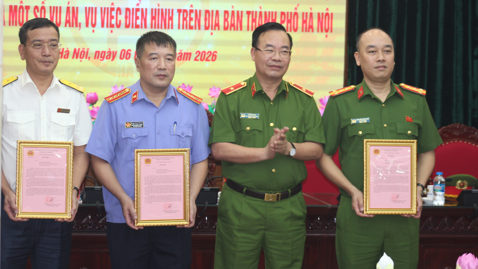 Thừa ủy quyền của lãnh đạo cấp trên, lãnh đạo Cục nghiệp vụ Bộ Công an trao Thư khen của Bộ trưởng Bộ Công an khen các đơn vị của Công an TP Hà Nội, VKSND TP Hà Nội, Cục Thuế Hà Nội.