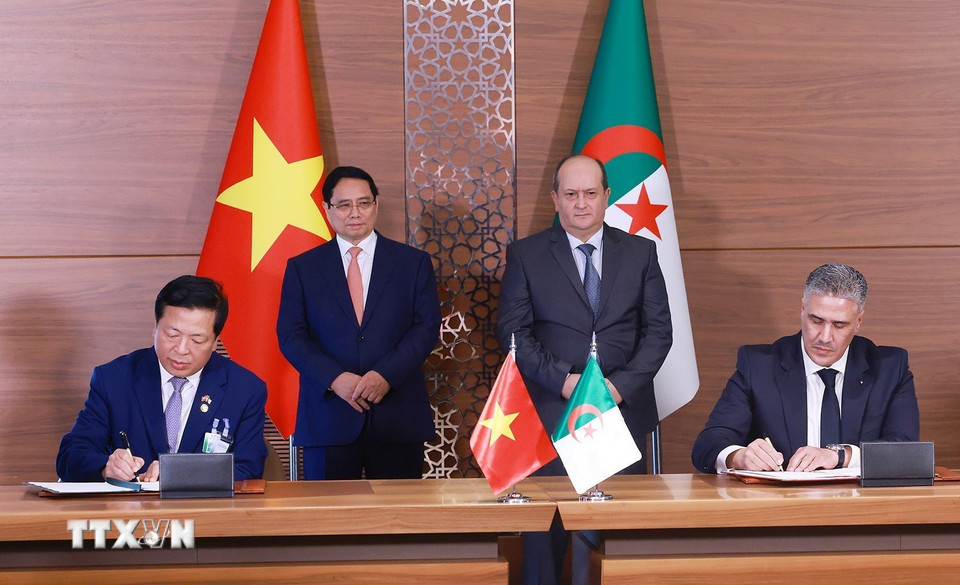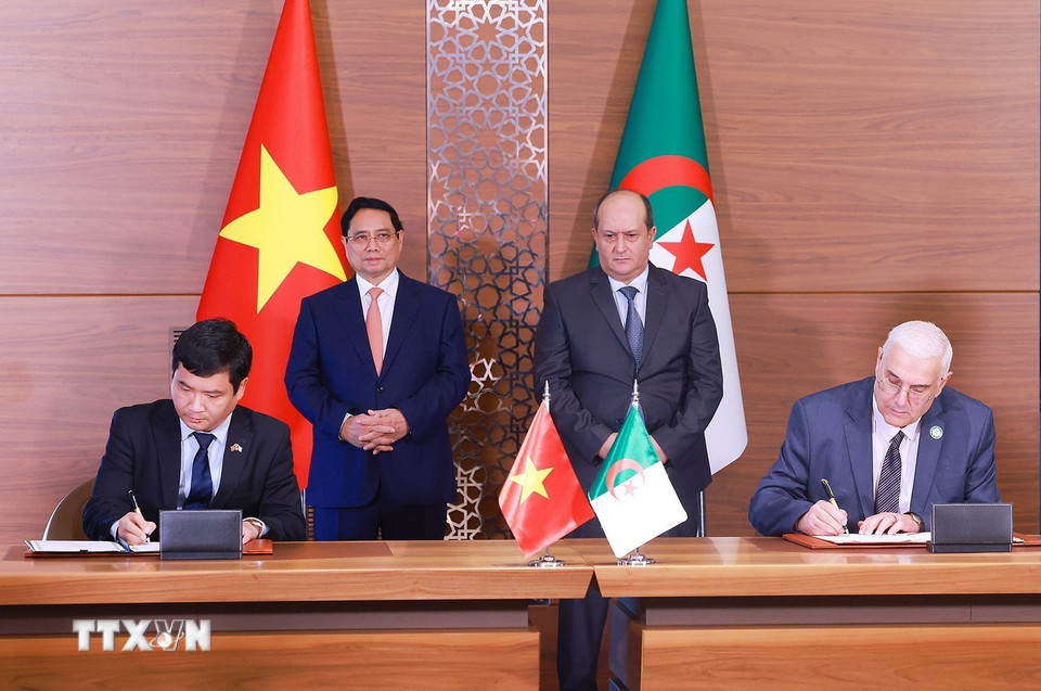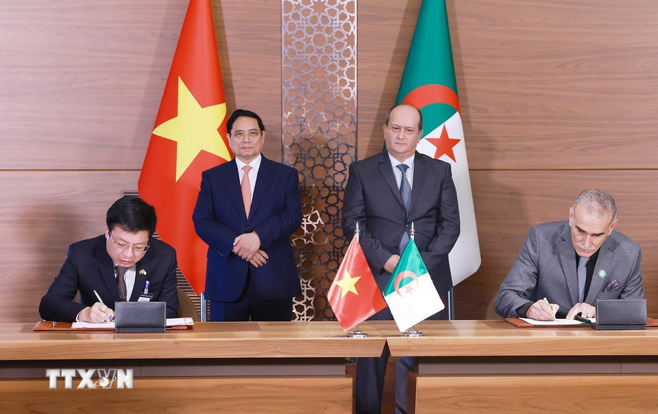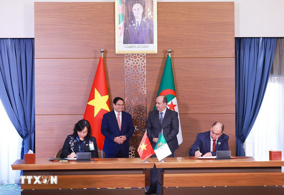 Thủ tướng Phạm Minh Chính và Thủ tướng Algeria Sifi Ghrieb chứng kiến ký Bản ghi nhớ giữa Liên đoàn thương mại và công nghiệp Việt Nam (VCCI) và Phòng Thương mại và Công nghiệp Algeria (CACI). (Ảnh: Dương Giang/TTXVN)