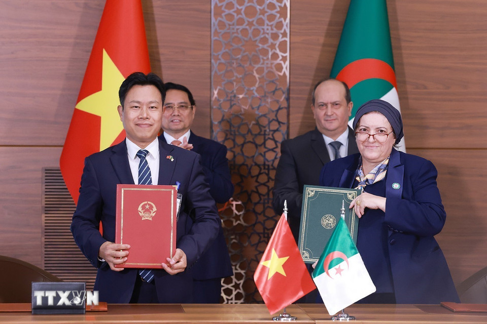 Thủ tướng Phạm Minh Chính và Thủ tướng Algeria Sifi Ghrieb chứng kiến ký ý định thư giữa Bộ Công Thương và Bộ Ngoại thương và xúc tiến xuất khẩu Algeria về thúc đẩy khởi xướng đàm phán Hiệp định thương mại ưu đãi song phương thí điểm. (Ảnh: Dương Giang/TTXVN)