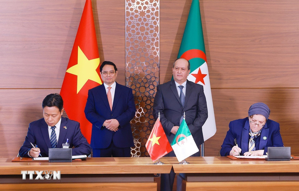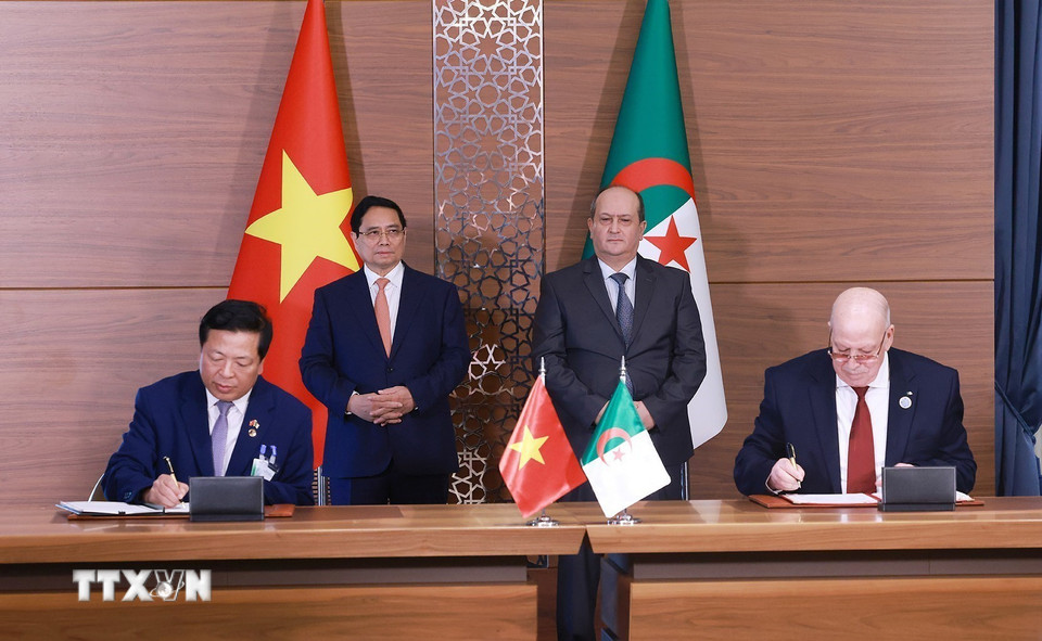 Thủ tướng Phạm Minh Chính và Thủ tướng Algeria Sifi Ghrieb chứng kiến ký Bản ghi nhớ hợp tác giữa Bộ Xây dựng Việt Nam và Bộ Nhà ở, Quy hoạch đô thị và thành phố Algeria trong lĩnh vực nhà ở, quy hoạch đô thị và thành phố. (Ảnh: Dương Giang/TTXVN)