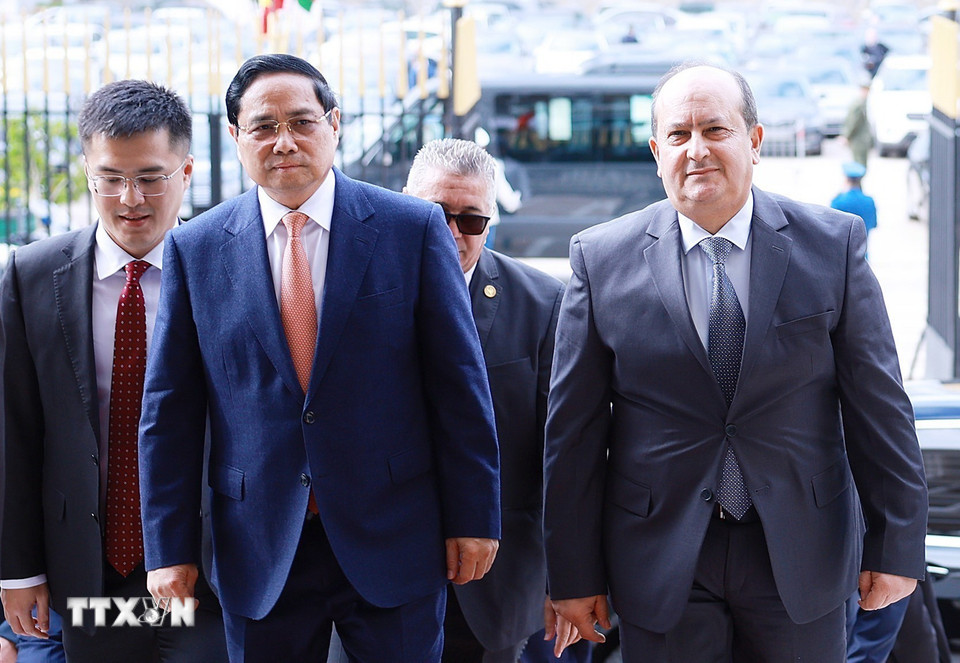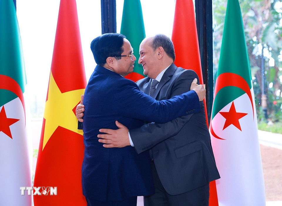 Thủ tướng Algeria Sifi Ghrieb đón Thủ tướng Phạm Minh Chính. (Ảnh: Dương Giang/TTXVN)