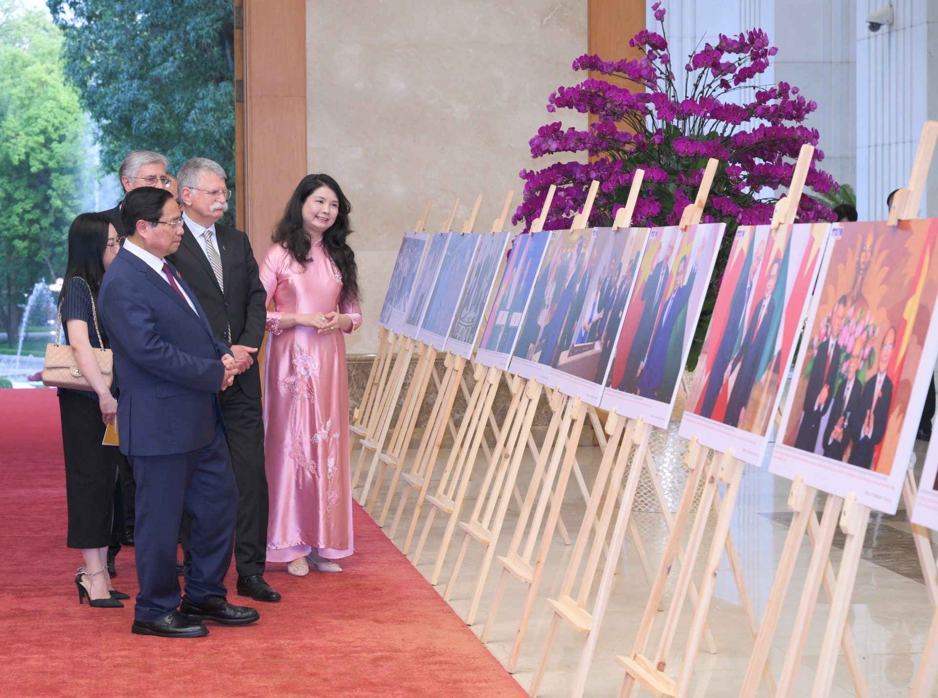 Thủ tướng Phạm Minh Chính và Chủ tịch Quốc hội Hungary Kover Laszlo xem những hình ảnh về hợp tác giữa hai nước.