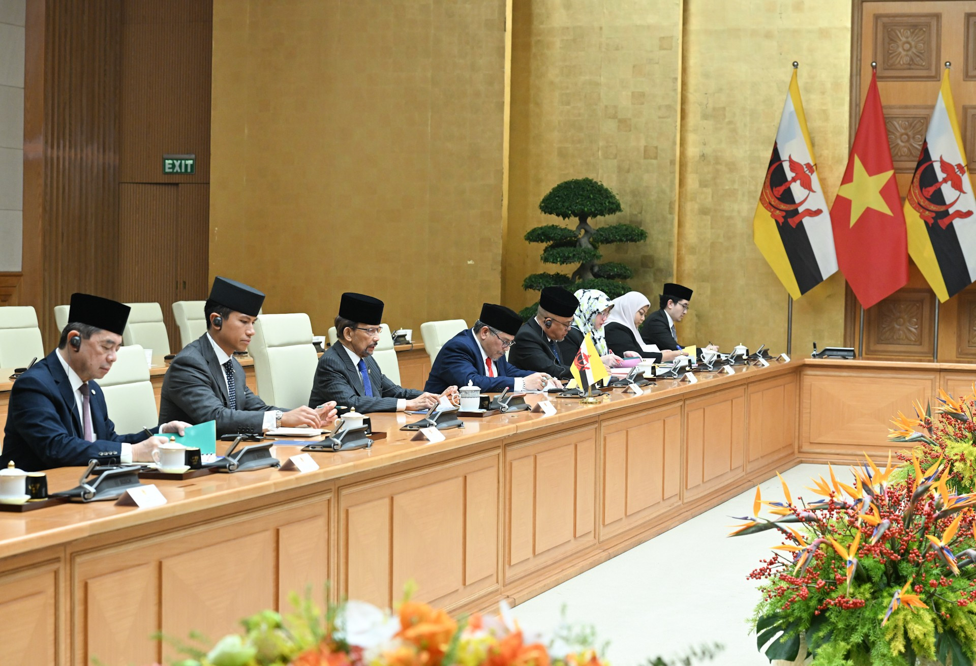Quốc vương Brunei Darussalam Haji Hassanal Bolkiah và các thành viên trong đoàn hội kiến với Thủ tướng Phạm Minh Chính.
