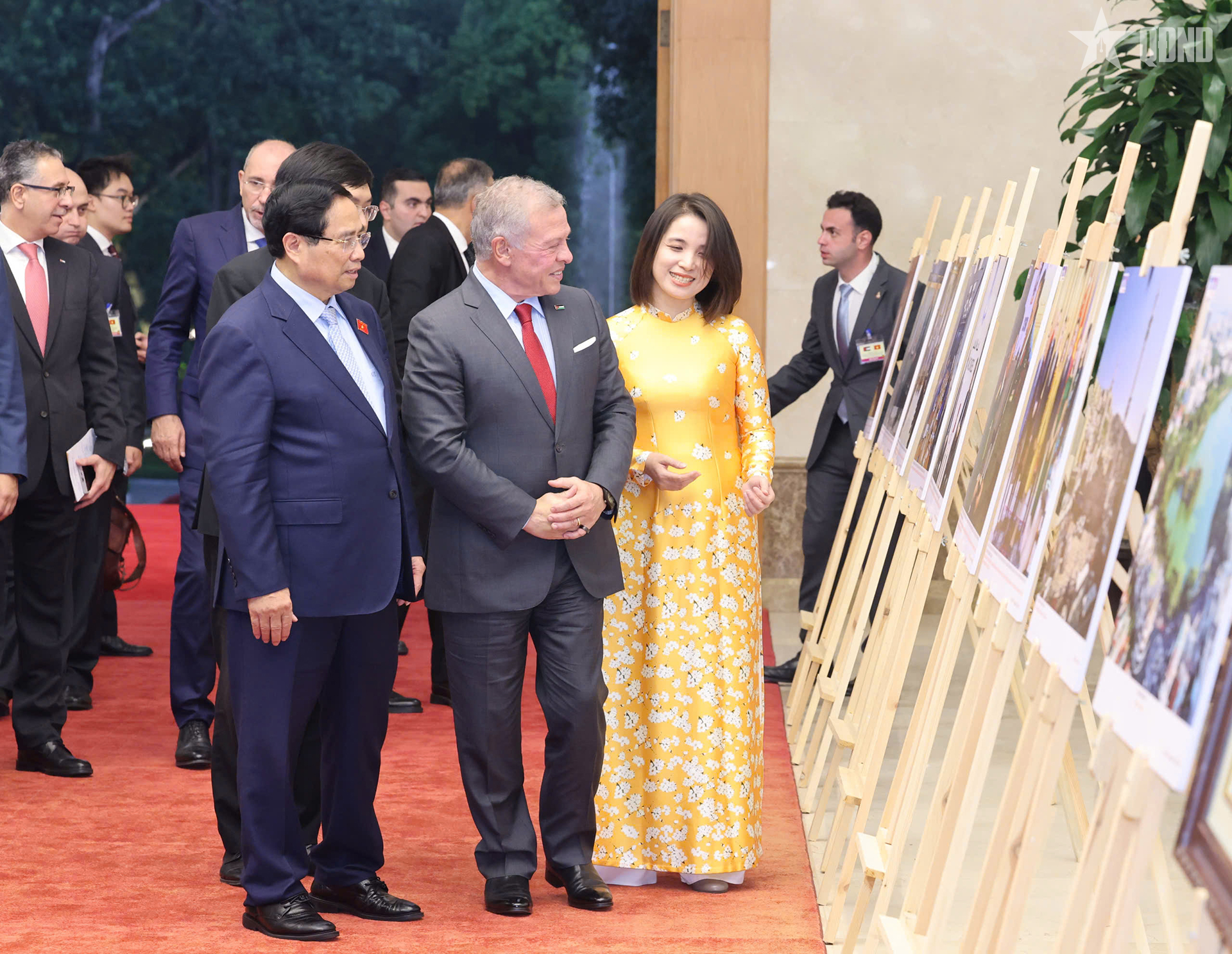 Thủ tướng Phạm Minh Chính và Quốc vương Abdullah II Ibn Al Hussein tham quan trưng bày ảnh về quan hệ hợp tác giữa hai nước. Ảnh: TRỌNG HẢI