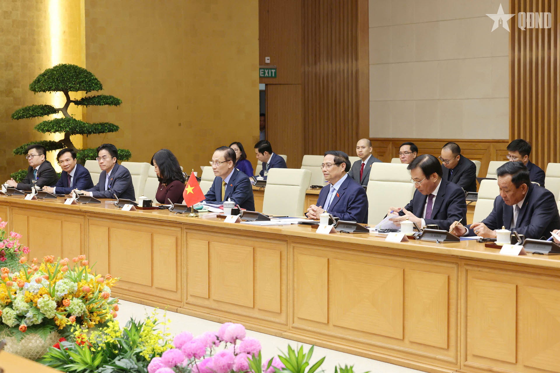 Thủ tướng Phạm Minh Chính và các thành viên đoàn Việt Nam tại cuộc hội kiến. Ảnh: TRỌNG HẢI