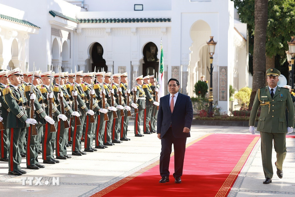 Thủ tướng Phạm Minh Chính đến hội kiến Tổng thống Algeria Abdelmadjid Tebboune. (Ảnh: Dương Giang/TTXVN)