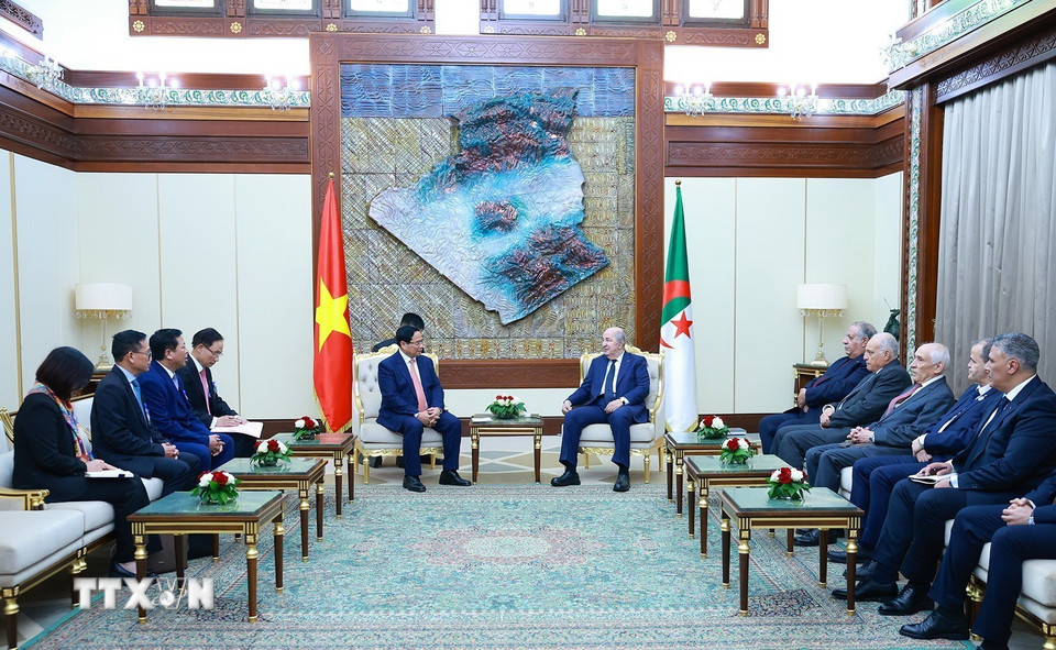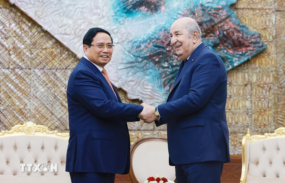 Thủ tướng Phạm Minh Chính hội kiến Tổng thống Algeria Abdelmadjid Tebboune. (Ảnh: Dương Giang/TTXVN)