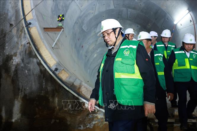 Thủ tướng Phạm Minh Chính kiểm tra công trường dự án tuyến đường sắt đô thị đoạn đường hầm ga S11 Văn Miếu. Ảnh: Dương Giang/TTXVN