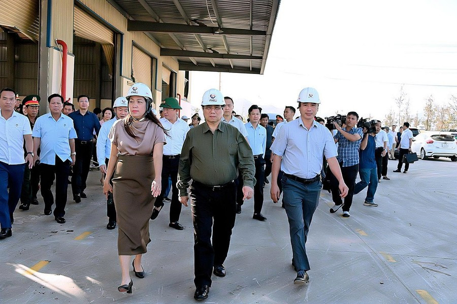 Thủ tướng Chính phủ Phạm Minh Chính cùng lãnh đạo tỉnh kiểm tra thực tế tình hình thiệt hại tại các doanh nghiệp. Ảnh: Đức Thụy