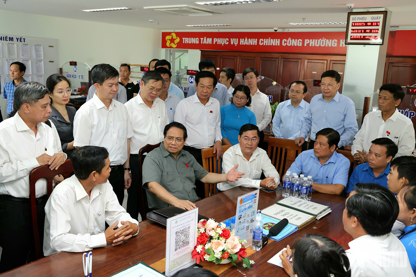 Thủ tướng Phạm Minh Chính kiểm tra vận hành chính quyền hai cấp tại Trung tâm phục vụ hành chính công phường Hưng Phú (TP Cần Thơ).