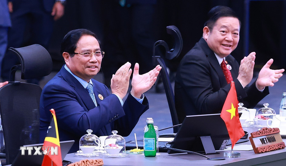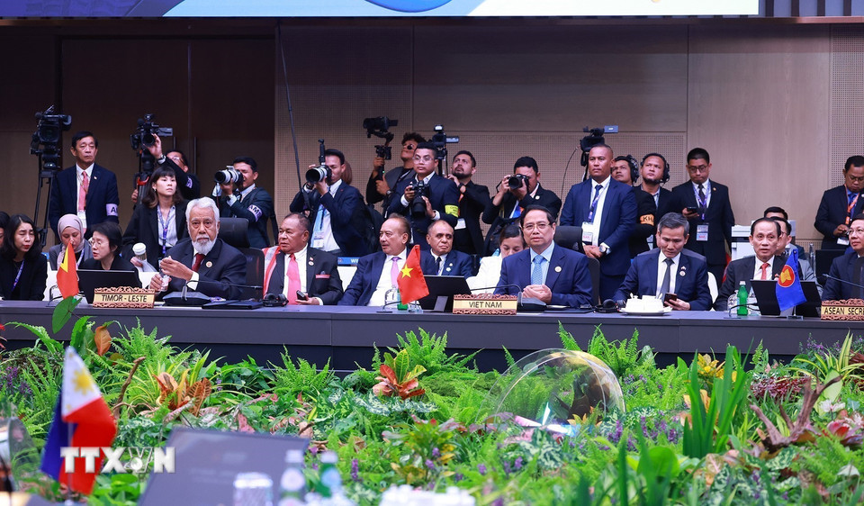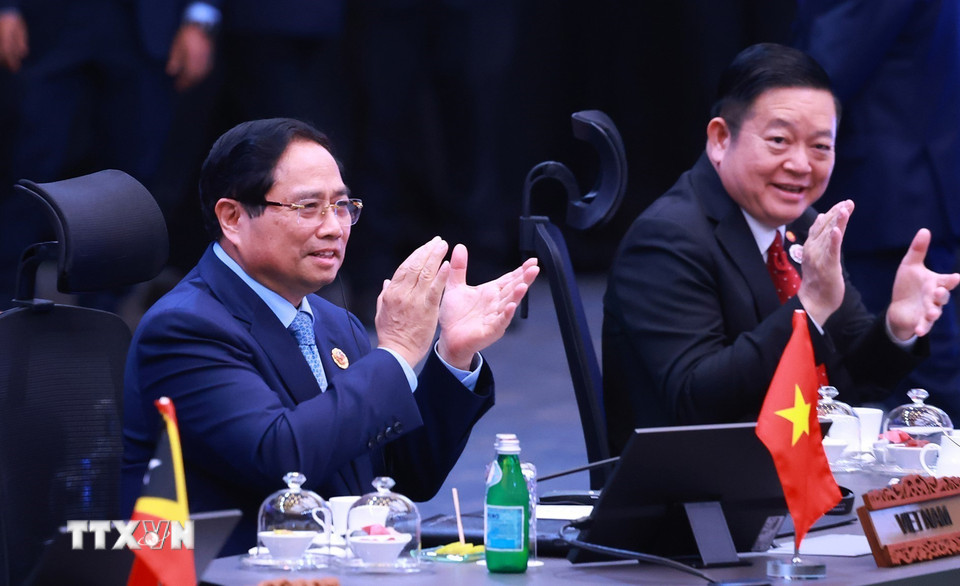 Thủ tướng Phạm Minh Chính và các Trưởng đoàn cùng Thủ tướng Nhật Bản Takaichi Sanae tham dự Hội nghị Cấp cao ASEAN-Nhật Bản lần thứ 28. (Ảnh: Dương Giang/TTXVN)