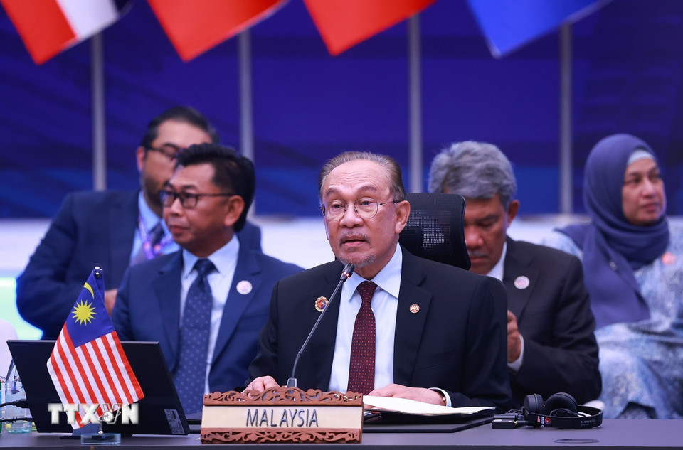 Thủ tướng Malaysia Anwar Ibrahim, Chủ tịch ASEAN 2025 phát biểu. (Ảnh: Dương Giang/TTXVN)