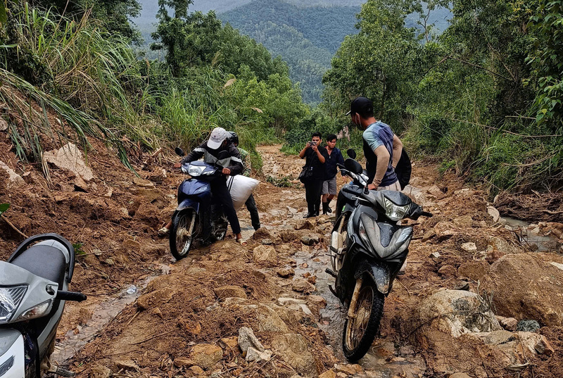Do đường đã bị cuốn trôi nên giao thông vào 2 thôn Phú Hải, Phú Đồng (xã Phú Mỡ, tỉnh Đắk Lắk) vẫn còn khó khăn. Ảnh: Hải Hậu