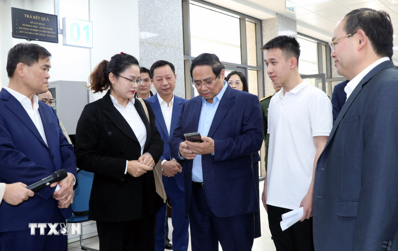 Thủ tướng Phạm Minh Chính ghi nhận đánh giá chất lượng dịch vụ công từ người dân. (Ảnh: Văn Đức/TTXVN)