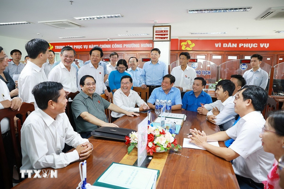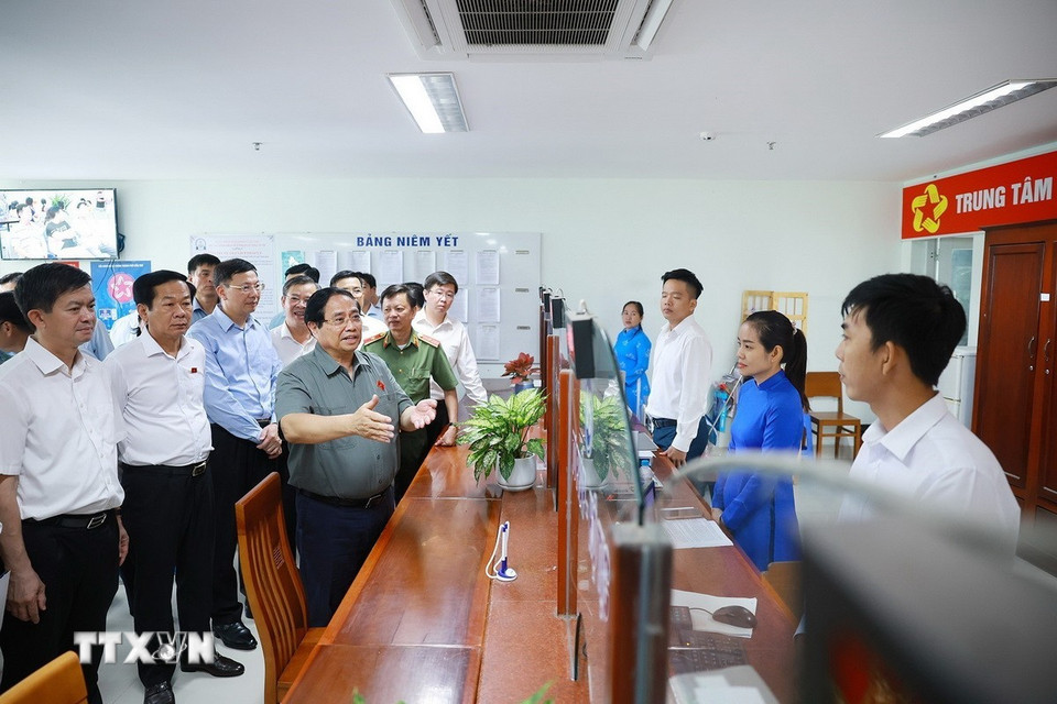 Thủ tướng Phạm Minh Chính kiểm tra tình hình hoạt động của Trung tâm phục vụ hành chính công phường Hưng Phú, Thành phố Cần Thơ. (Ảnh: Dương Giang/TTXVN)