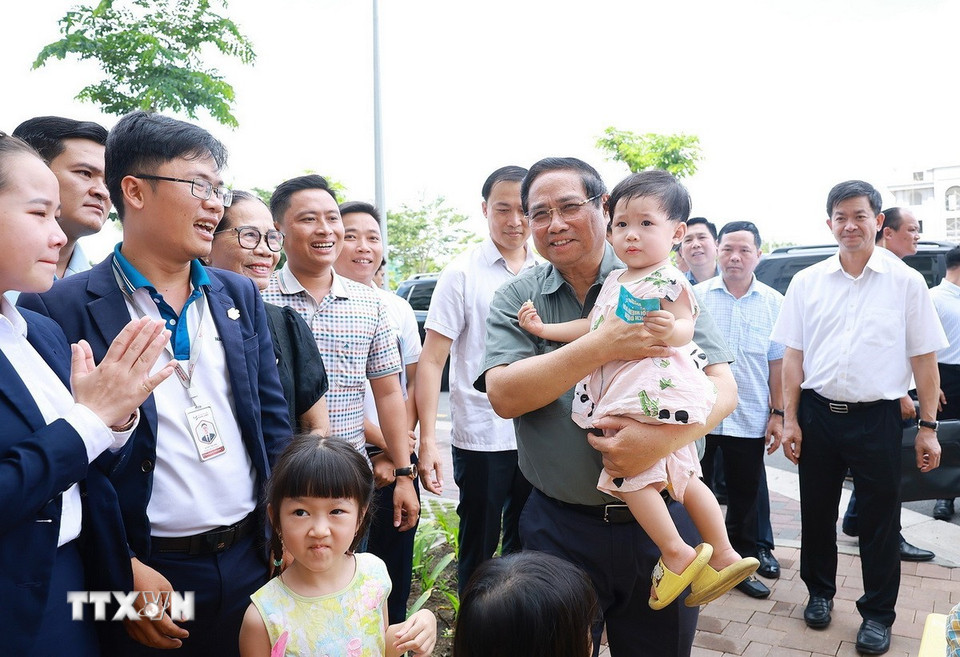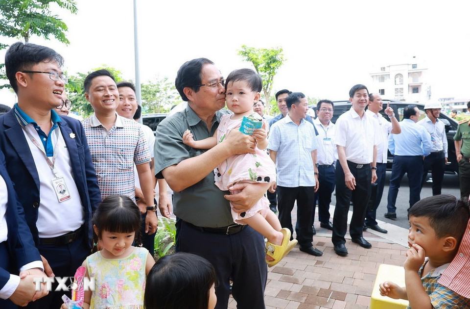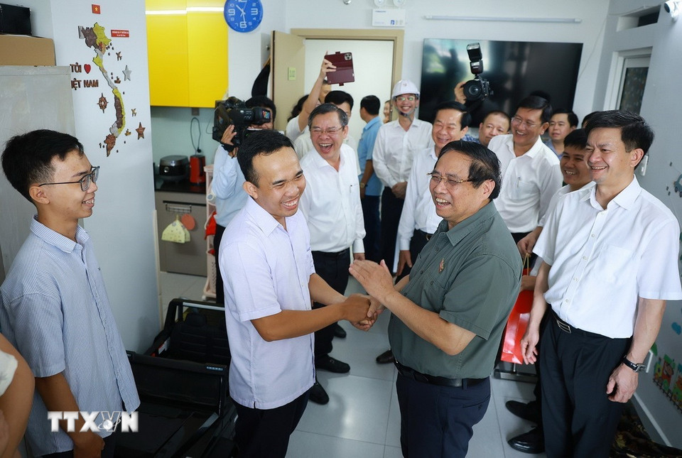 Thủ tướng Phạm Minh Chính thăm người dân sinh sống tại Khu nhà ở xã hội của thành phố Cần Thơ. (Ảnh: Dương Giang/TTXVN)