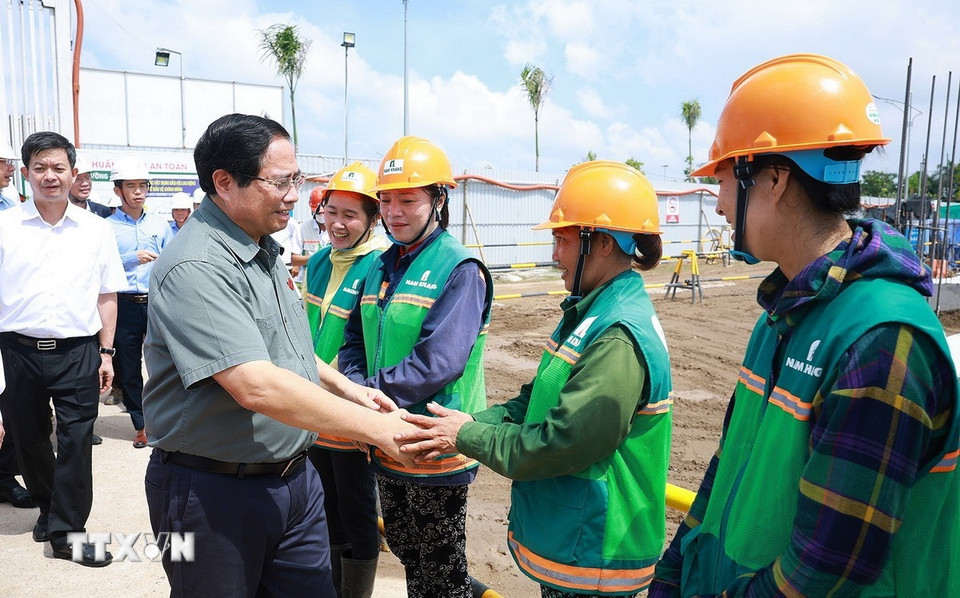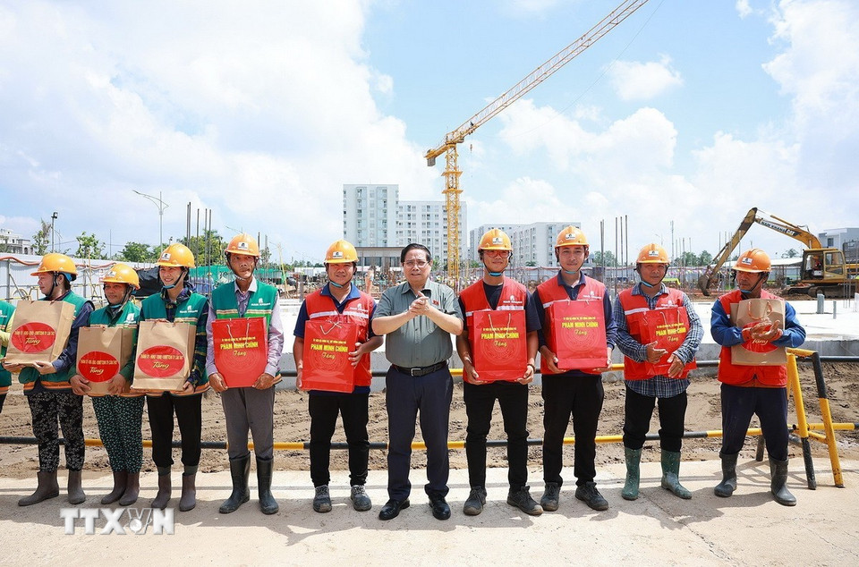 Thủ tướng Phạm Minh Chính với công nhân thi công dự án Khu nhà ở xã hội của thành phố Cần Thơ. (Ảnh: Dương Giang/TTXVN)