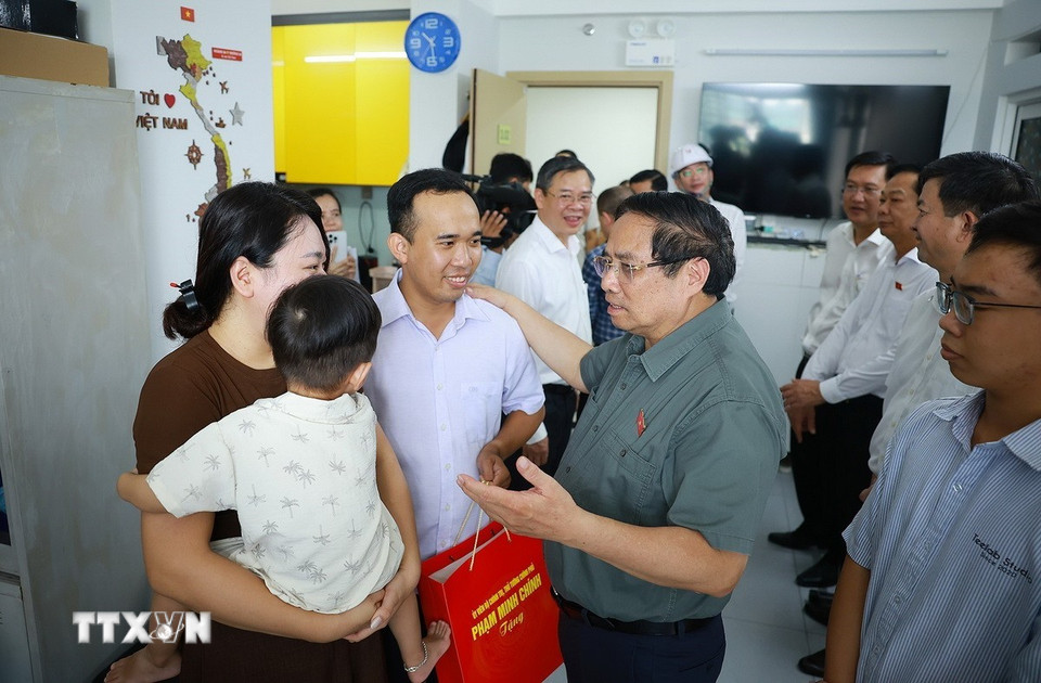 Thủ tướng Phạm Minh Chính thăm hộ dân sinh sống tại Khu nhà ở xã hội của thành phố Cần Thơ. (Ảnh: Dương Giang/TTXVN)