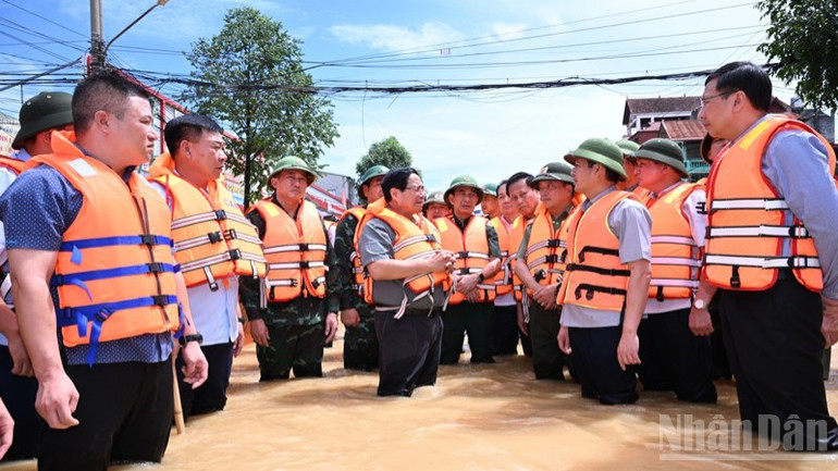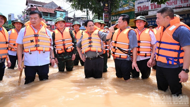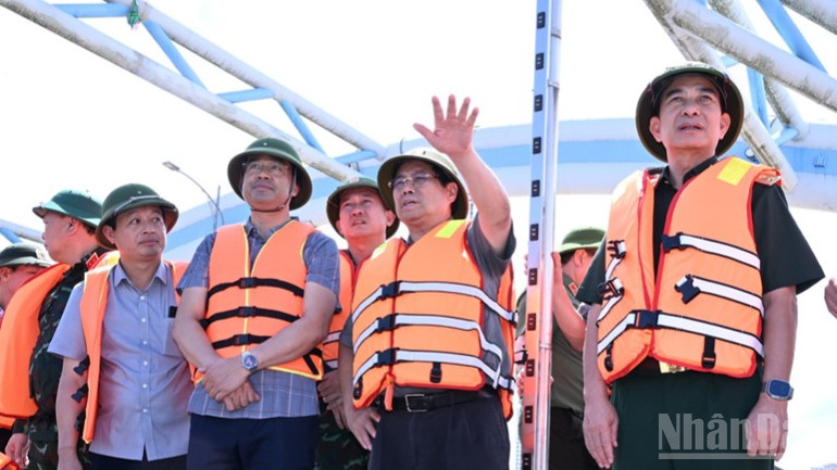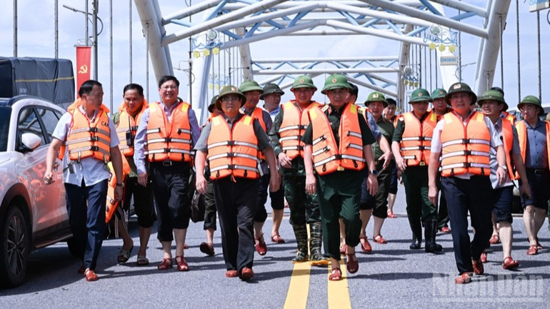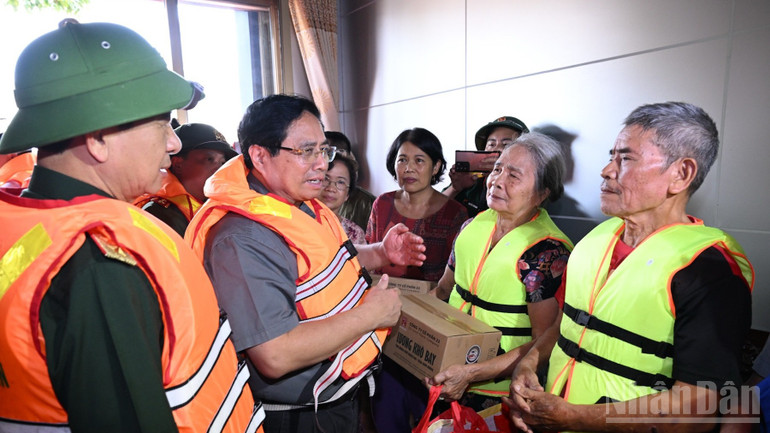 Thủ tướng Chính phủ Phạm Minh Chính thị sát, thăm hỏi, động viên bà con, chỉ đạo công tác khắc phục hậu quả mưa lũ sau bão. (Ảnh: TRẦN HẢI)