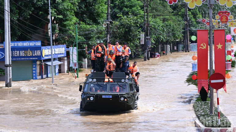Thủ tướng Phạm Minh Chính và Đoàn công tác đi thị sát vùng lũ ở Thái Nguyên bằng xe thiết giáp lội nước. (Ảnh: TRẦN HẢI)