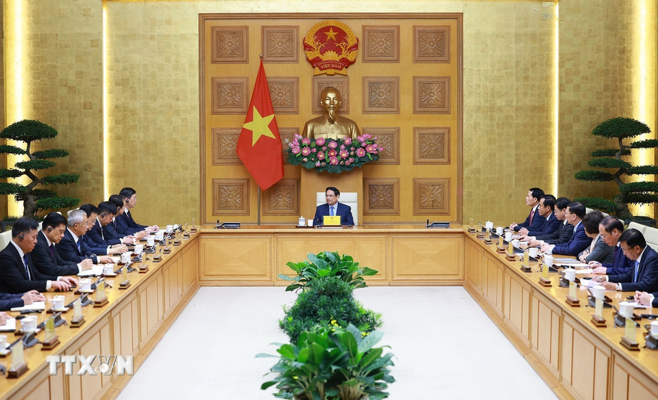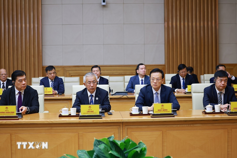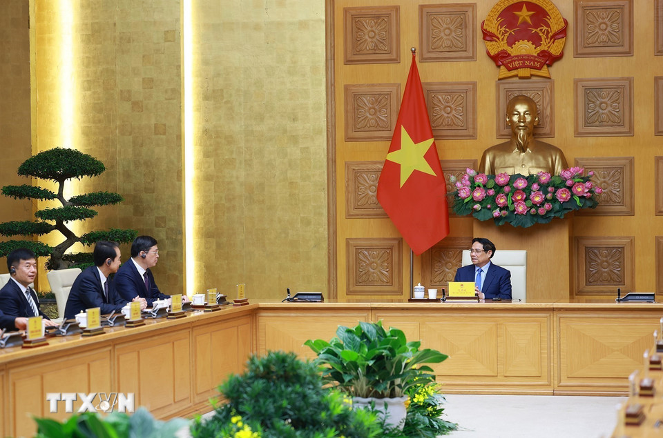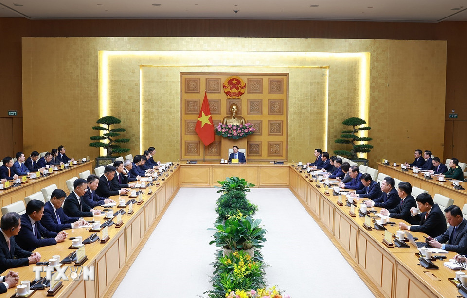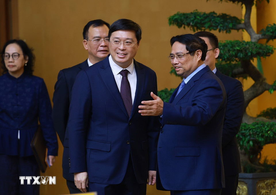 Thủ tướng Phạm Minh Chính tiếp ông Vi Thao, Chủ tịch Khu tự trị dân tộc Choang Quảng Tây, Trung Quốc và đoàn doanh nghiệp. (Ảnh: Dương Giang/TTXVN)