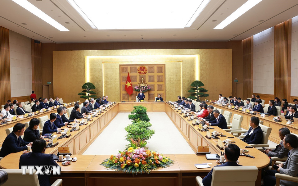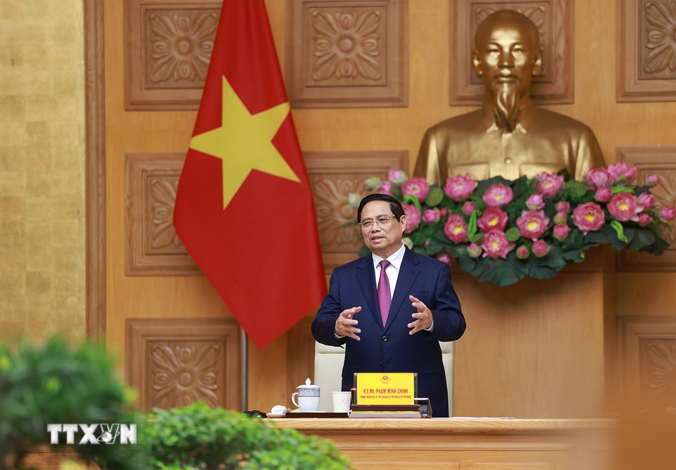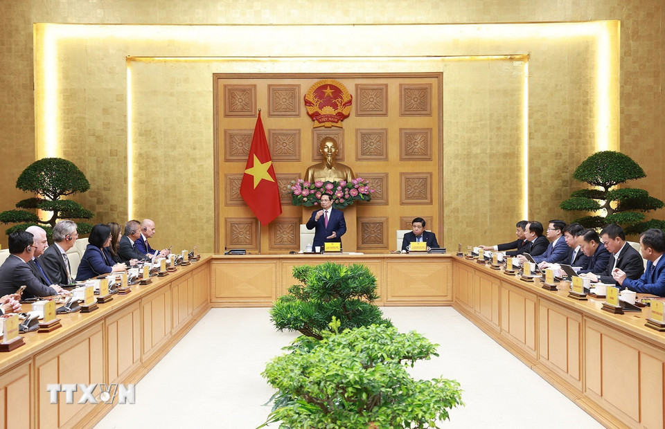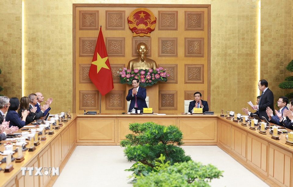 Thủ tướng Phạm Minh Chính tiếp đoàn lãnh đạo doanh nghiệp bán dẫn quốc tế. (Ảnh: Dương Giang/TTXVN)