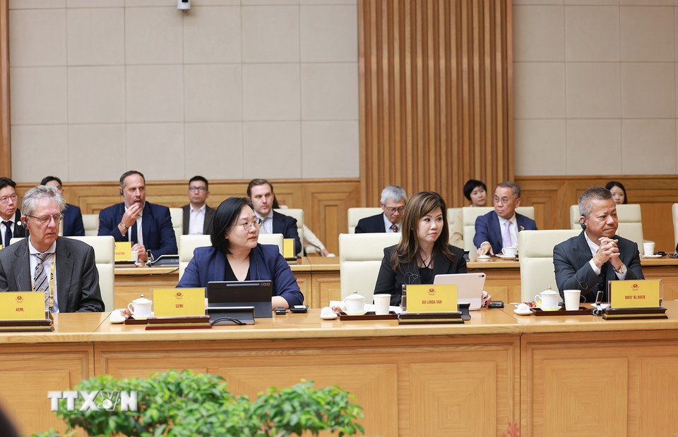 Đoàn lãnh đạo doanh nghiệp bán dẫn quốc tế tham dự buổi tiếp. (Ảnh: Dương Giang/TTXVN)