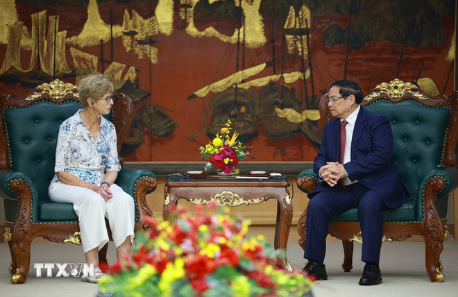 Thủ tướng Phạm Minh Chính tiếp Đoàn Quỹ Eisenhower của Hoa Kỳ đang thăm và làm việc tại Việt Nam. (Ảnh: Dương Giang/TTXVN)