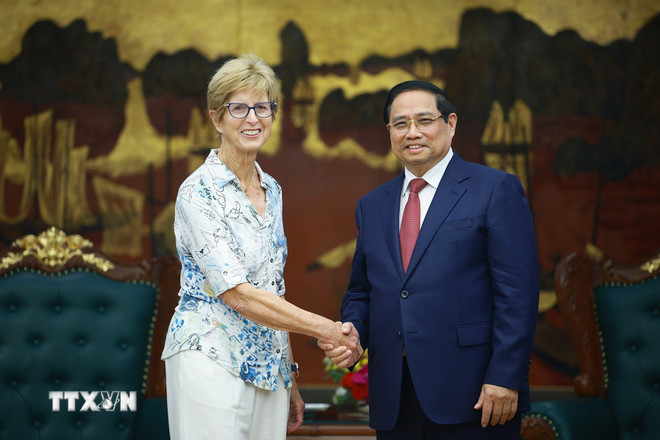 Thủ tướng Phạm Minh Chính tiếp Đoàn Quỹ Eisenhower của Hoa Kỳ. (Ảnh: Dương Giang/TTXVN)