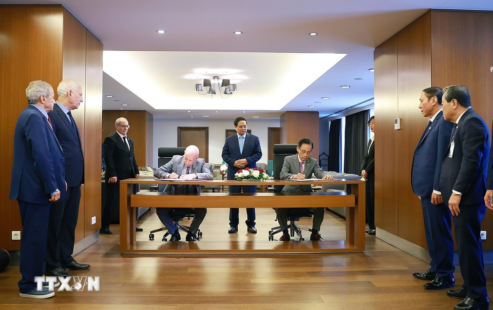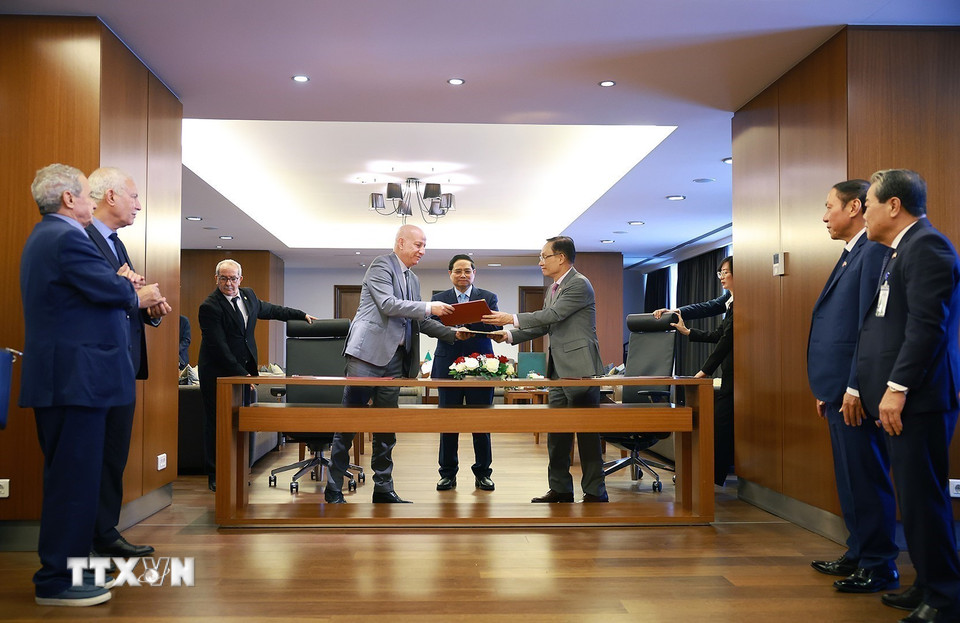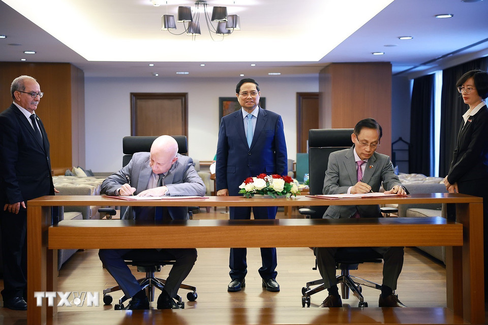 Thủ tướng Phạm Minh Chính chứng kiến ký thuận hợp tác giữa Đảng Mặt trận Giải phóng Dân tộc Algeria (FLN) và Đảng Cộng sản Việt Nam. (Ảnh: Dương Giang/TTXVN)