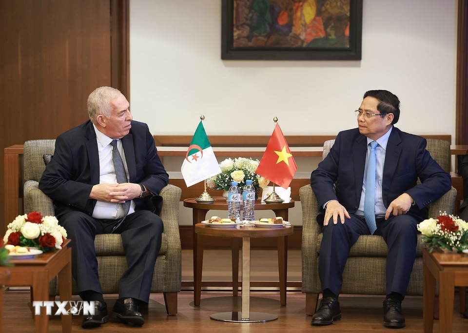 Thủ tướng Phạm Minh Chính tiếp ông Abdelmalek Tacherift, Bộ trưởng Cựu chiến binh và Người có công Algeria. (Ảnh: Dương Giang/TTXVN)