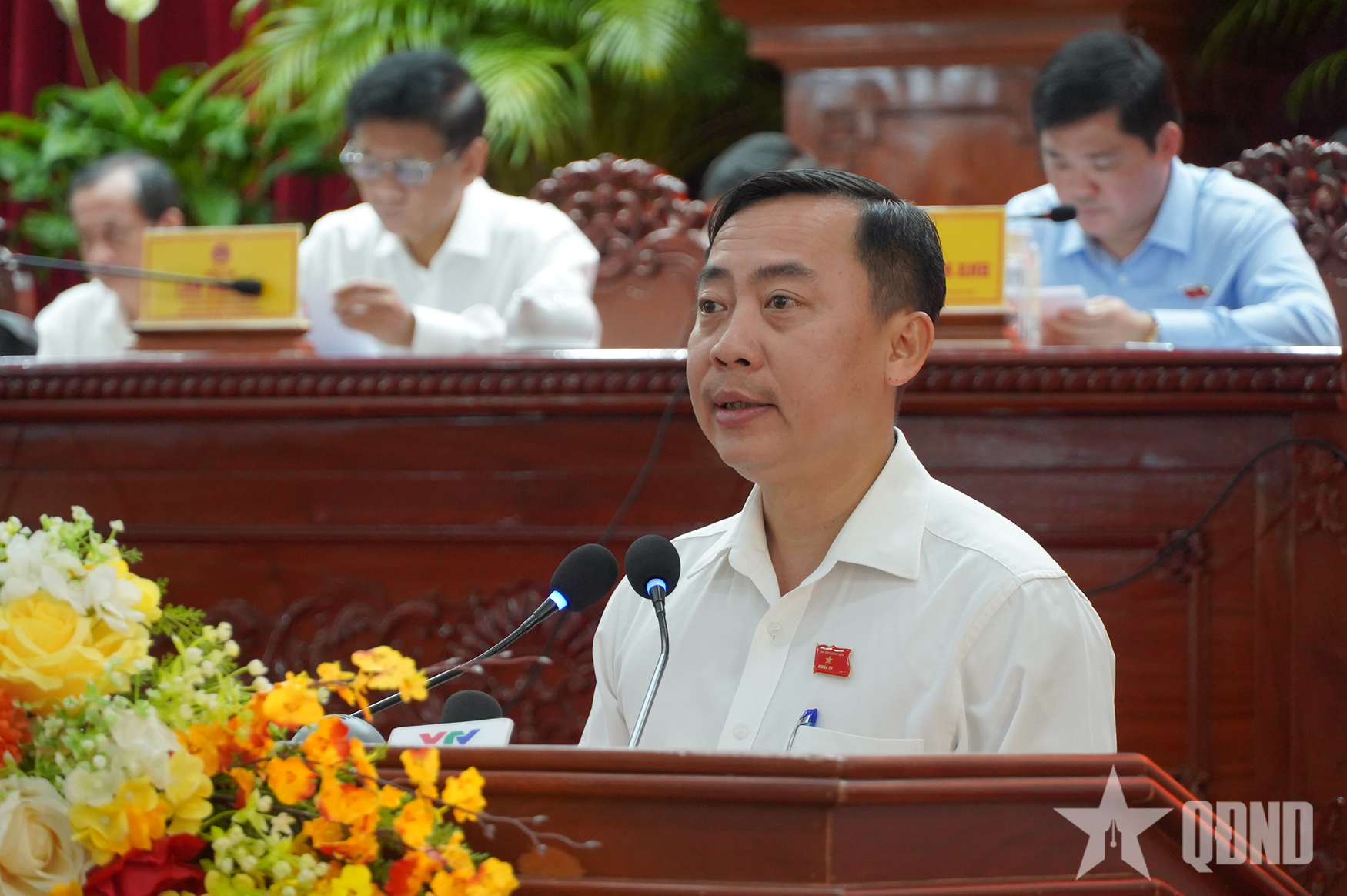 Đồng chí Đào Chí Nghĩa, Thành ủy viên, Phó trưởng đoàn Đại biểu Quốc hội TP Cần Thơ báo cáo tại hội nghị tiếp xúc cử tri.