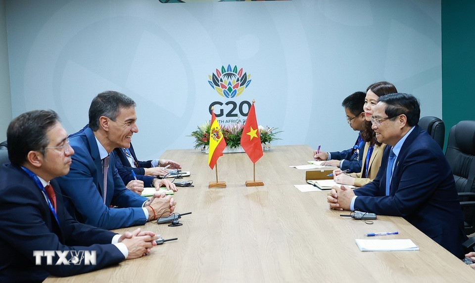 Thủ tướng Phạm Minh Chính gặp Thủ tướng Tây Ban Nha Pedro Sánchez. (Ảnh: Dương Giang/TTXVN)