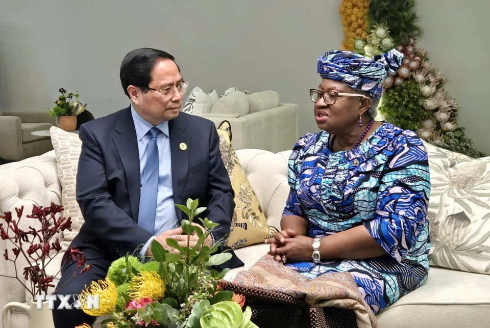 Thủ tướng Phạm Minh Chính gặp bà Ngozi Okonjo-Iweala, Tổng Giám đốc Tổ chức Thương mại Thế giới (WTO). (Ảnh: TTXVN phát)