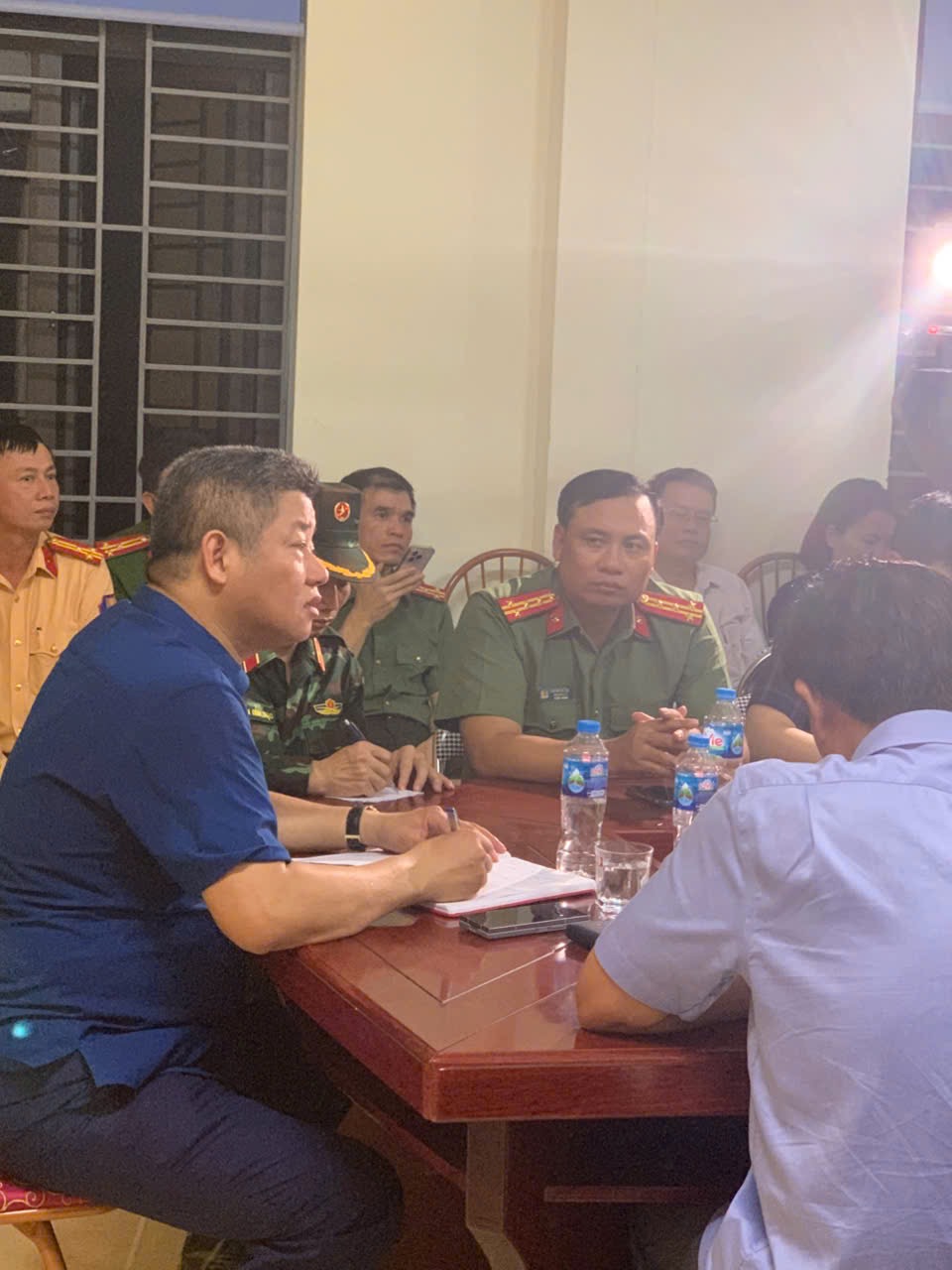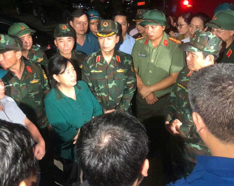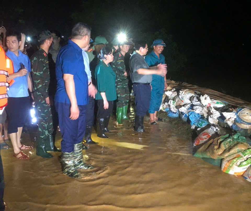 Đồng chí Bùi Thị Minh Hoài, BÍ thư Thành ủy Hà Nội,nghe lực lượng Công an, Quân đội báo cáo nhanh tình hình ứng phó, xử lý sự cố nước sông tràn qua đê tại các địa bàn xã Đa Phúc, Trung Giã, Sóc Sơn