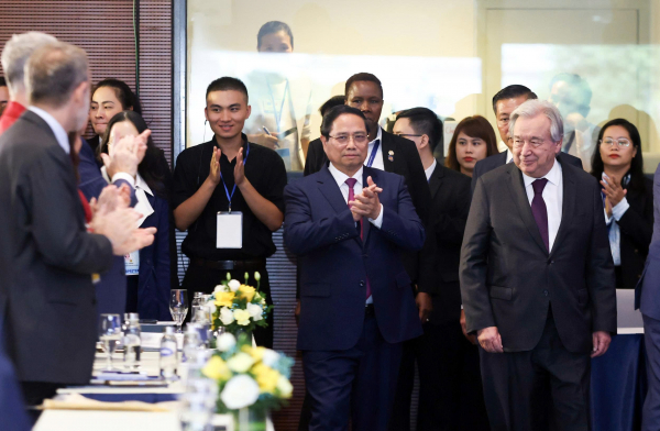 "Chúng tôi vẫn đảm bảo độc lập chủ quyền, trật tự, an toàn xã hội. Chủ quyền trên không gian mạng cũng đạt được những thành tựu rất ấn tượng, xếp thứ 16 trên toàn cầu về an ninh mạng - thể hiện sự tin tưởng mà LHQ đã trao cho chúng tôi, về sứ mệnh tổ chức Lễ ký Công ước Hà Nội, đảm bảo an toàn an ninh mạng cũng như phát triển, chuyển đổi số. Chúng tôi luôn luôn theo đuổi đường lối đối ngoại độc lập, tự chủ, đa dạng hóa, đa phương hóa, là bạn bè tốt, là đối tác tin cậy của tất cả cả nước trên thế giới, là thành viên có trách nhiệm với cộng đồng quốc tế, vì mục tiêu hòa bình, hợp tác, phát triển", Thủ tướng chia sẻ thêm và gửi lời chúc Tổng Thư ký LHQ António Guterres cùng các đại biểu có một kỳ công tác tại Thủ đô Hà Nội vui vẻ, hạnh phúc và luôn tin tưởng vào Việt Nam...